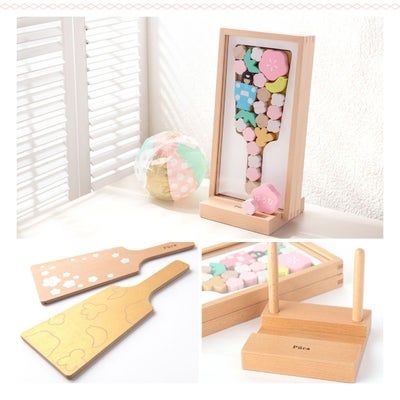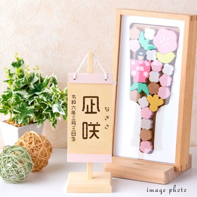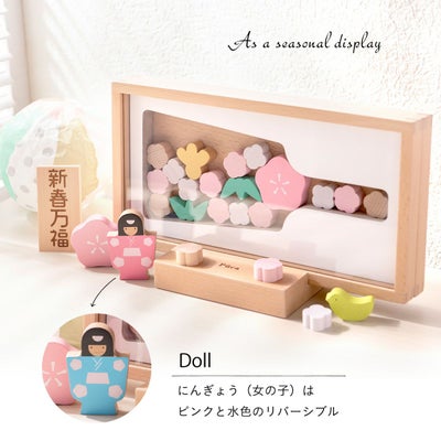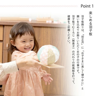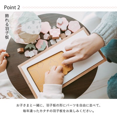 親しみ易く、楽しく手軽に飾れる積み木のような温もりのある木製の羽子板です。一緒に飾れるようになったお子様の成長の喜びを感じてください。