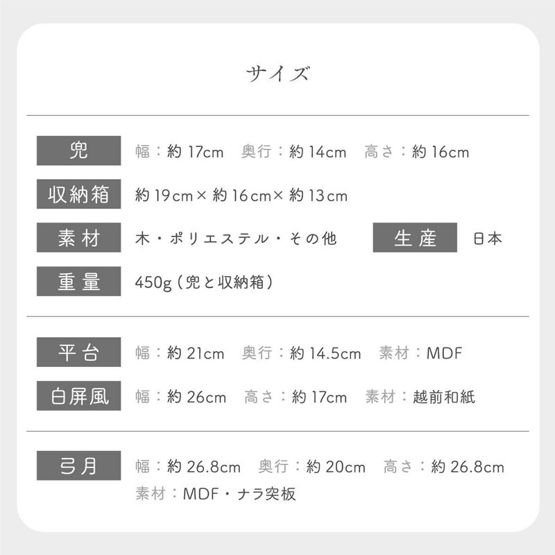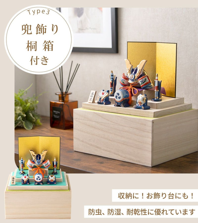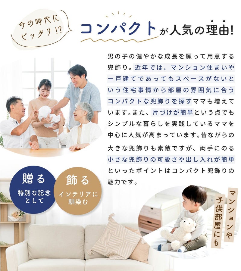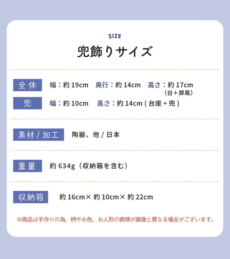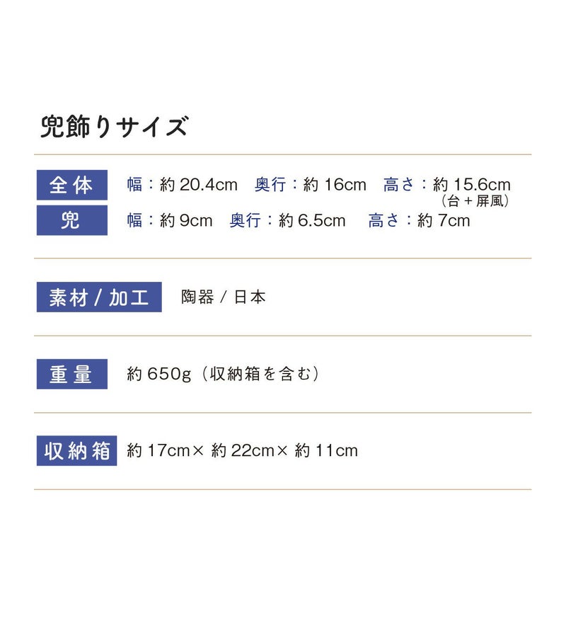 他の画像を見る 定価 ¥ 6,050 のところ 販売価格 ¥ 6,050 税込 詳細を見る お気に入りに登録する 送料無料 おしゃれでモダンな五月人形! 端午の節句を華やかに! 省スペースで飾れる 五月人形 兜 兜飾り コンパクト かわいい 初節句 2026年 錦彩桃太郎(収納桐箱台付) 薬師窯