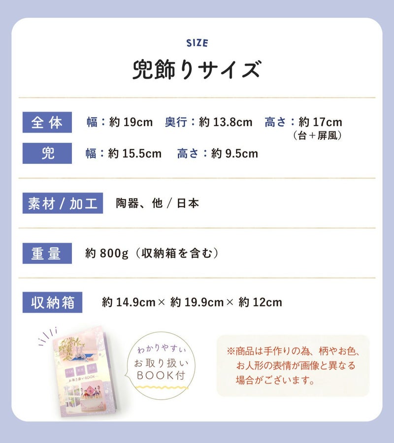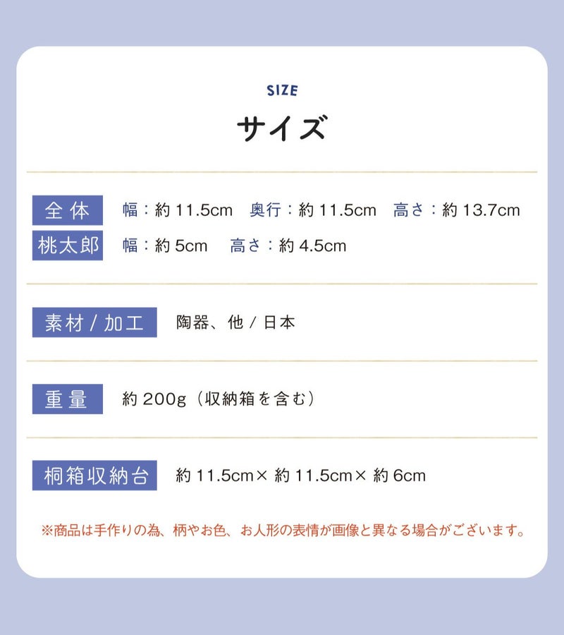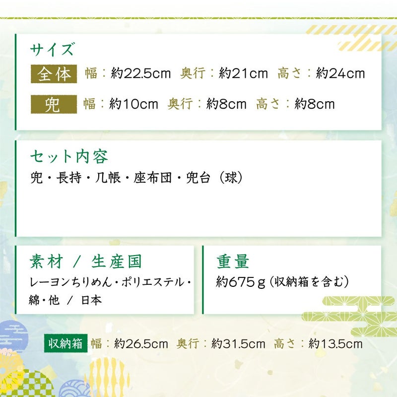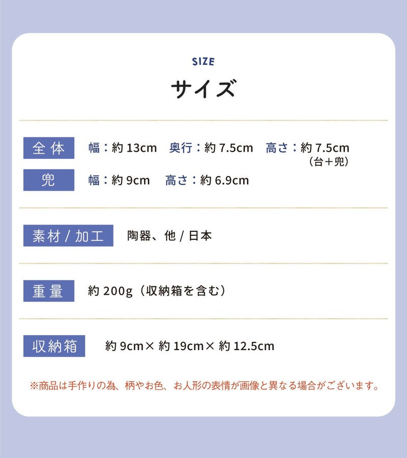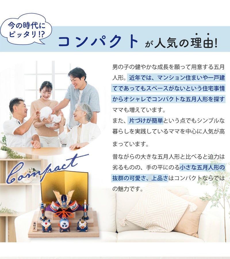 他の画像を見る 定価 ¥ 6,050 のところ 販売価格 ¥ 6,050 税込 詳細を見る お気に入りに登録する 送料無料 おしゃれでモダンな五月人形! 端午の節句を華やかに! 省スペースで飾れる 五月人形 兜 兜飾り コンパクト かわいい 初節句 2026年 錦彩桃太郎(収納桐箱台付) 薬師窯