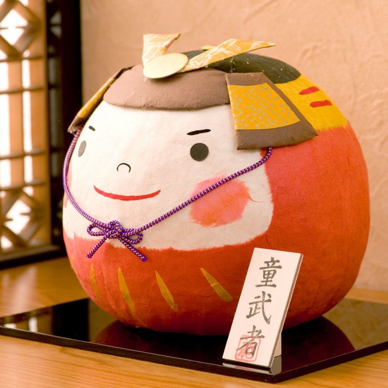 【ちぎり和紙ぽっちゃりダルマ武者】ちりめんとは対極の素材のちぎり和紙製の兜「ちぎり和紙ぽっちゃりダルマ」です。まん丸のぽっちゃりした童武者の表情がなんともかわいいです。日本製