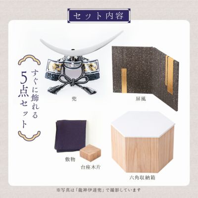 ●五月人形 新作 コンパクト おしゃれ 兜 兜飾り 兜用収納飾り 六角 台つき ミニ 木製 戦国武将兜 皇宸 オリジナル 道具 セット 出世兜 人気 龍神謙信/吉祥龍/龍神伊達/龍王/家康●