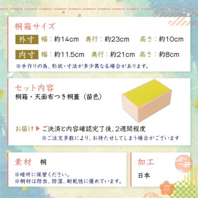 桐箱サイズ(cm):外寸-幅約14/奥行23/高さ10 ・ 内寸-幅約11.5/奥行21/高さ8
