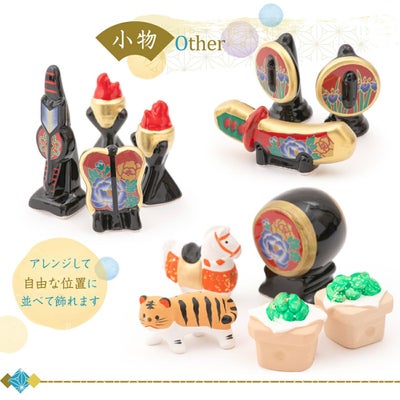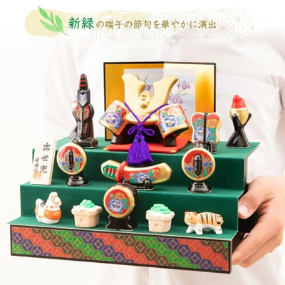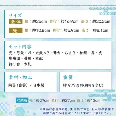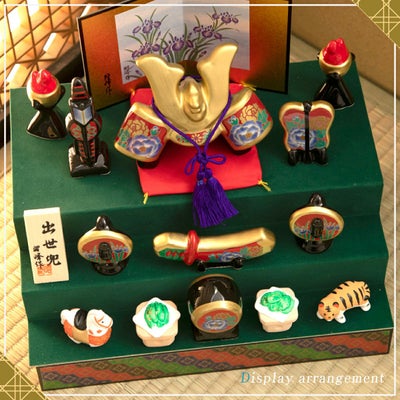 付属:兜・弓矢・刀・太鼓・篝火・ちまき・柏餅・馬・虎・軍配・座布団・屏風・飾り台・立札