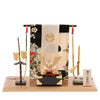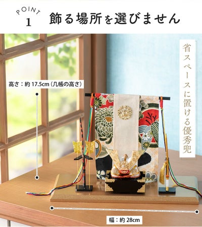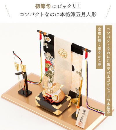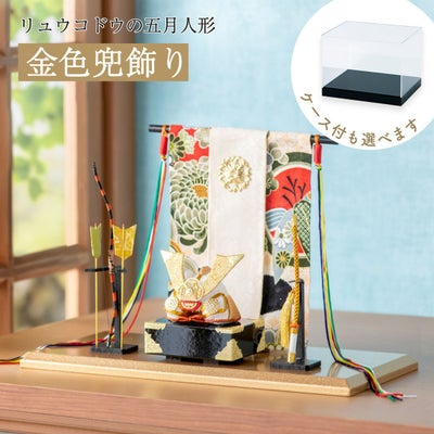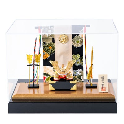 【金色兜飾り(弓太刀付)】金の兜と弓太刀を和柄の几帳で飾りました。