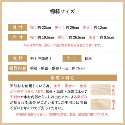 桐箱サイズ(cm):外寸-幅約22/奥行29/高さ12 ・ 内寸-幅約19.5/奥行26.5/高さ9.5