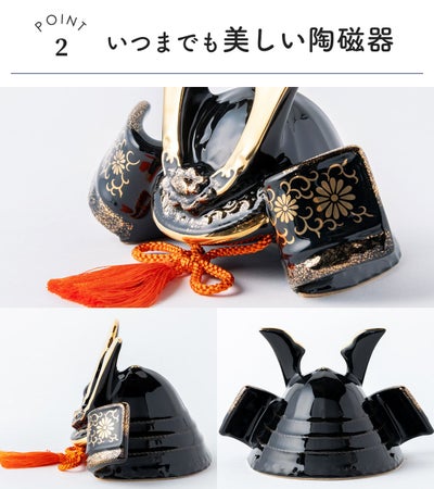 ちりめんとは対極の素材の陶磁器製の兜「出世兜」です。