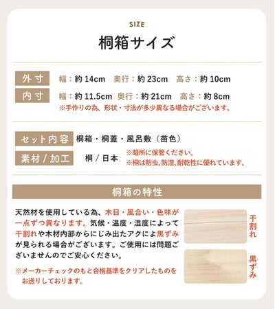 桐箱サイズ(cm):外寸-幅約14/奥行23/高さ10 ・ 内寸-幅約11.5/奥行21/高さ8