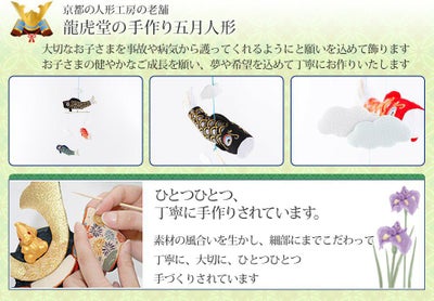 龍虎堂 五月人形【そよ風鯉モビール三匹 8-312】手書き名入れ木札つき 兜 鯉のぼり 京都人形工房リュウコドウの5月人形