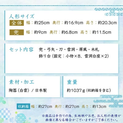 生産国:日本付属:人形・弓矢・刀・灯籠・ちまき・扇・陣笠・馬・太鼓・虎・屏風・立札・桐箱