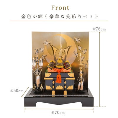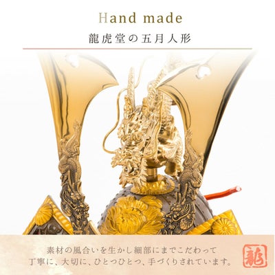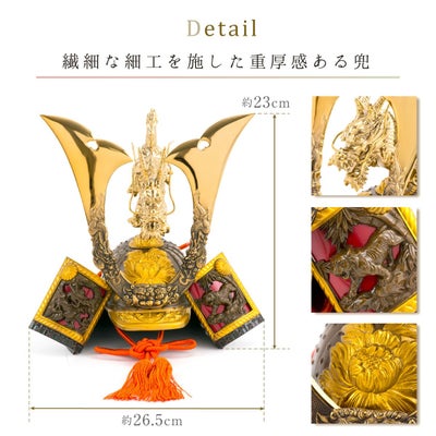 商品特徴:金色に輝く兜は、細部にまで繊細な細工が施してあり、重厚感がある兜です。