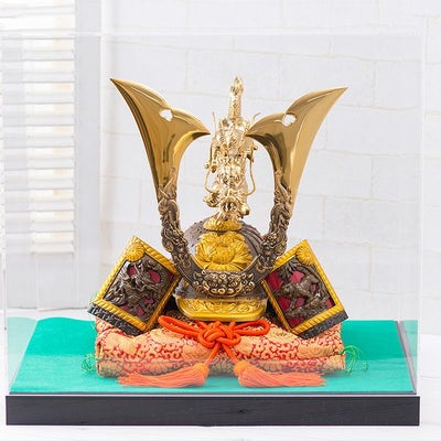 商品特徴:金色に輝く兜は、細部にまで繊細な細工が施してあり、重厚感がある兜です。