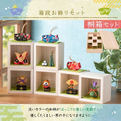赤色 青色 黒色 魔除けの兜 ちまき 柏餅 しょうぶ 扇子 太鼓 土鈴自身のお好みに重ねてお楽しみ頂ける桐箱のお飾りセットです。