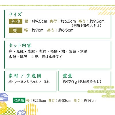 付属:兜・黒鯉・赤鯉・青鯉・柏餅・粽・菖蒲・軍扇・太鼓・陣笠・桐箱