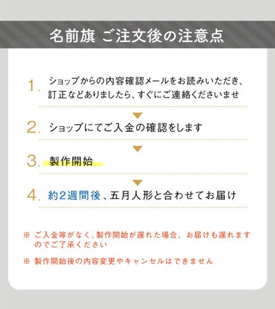 ●発注から仕上がりまで2週間程度いただきます。(ただし、GW期間、夏季・年末年休業や祝日は製作もストップしますので、さらにお時間をいただきます。)