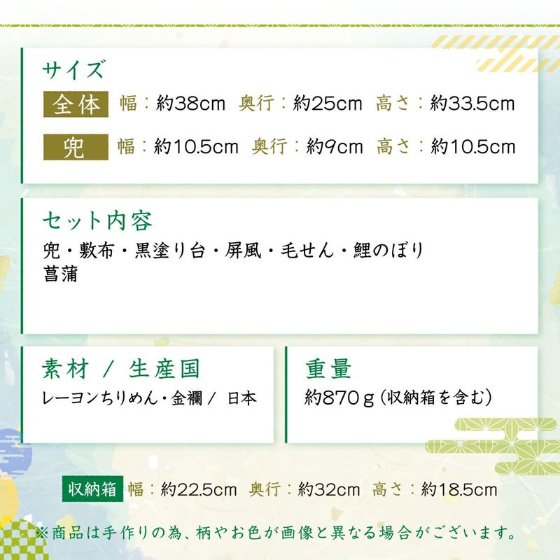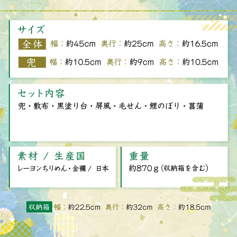 他の画像を見る 定価 ¥ 29,200 のところ 販売価格 ¥ 29,200 税込 詳細を見る お気に入りに登録する 送料無料 おしゃれでモダンな五月人形! 端午の節句を華やかに! 省スペースで飾れる 龍虎堂 五月人形 兜 兜飾り 鯉のぼり コンパクト かわいい 初節句 2026年 名前旗セット 刺繍 箱段お飾り ちりめん リュウコドウ