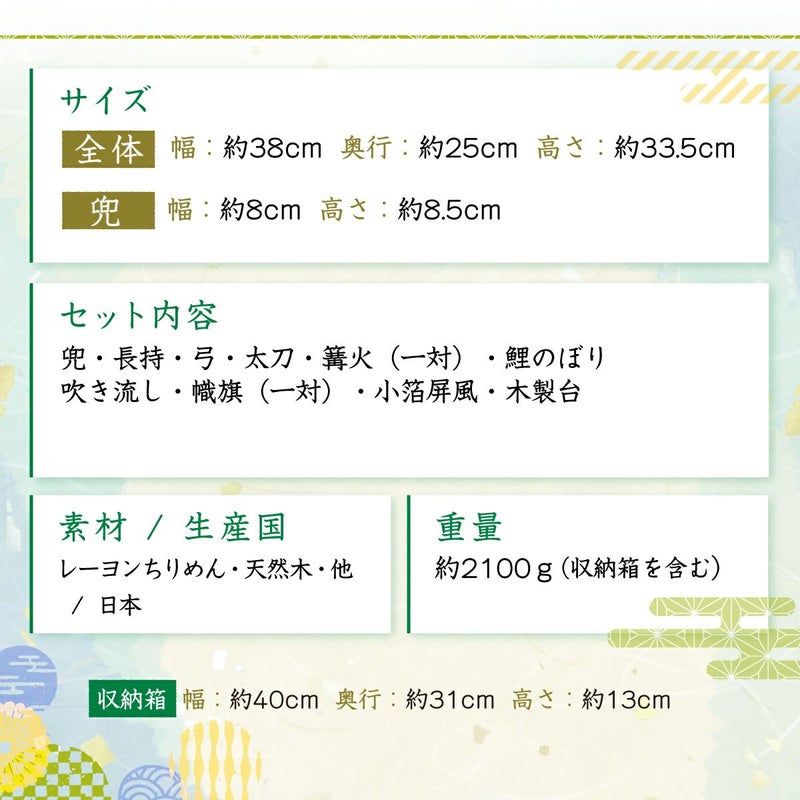 他の画像を見る 定価 ¥ 25,200 のところ 販売価格 ¥ 25,200 税込 詳細を見る お気に入りに登録する 送料無料 おしゃれでモダンな五月人形! 端午の節句を華やかに! 省スペースで飾れる 龍虎堂 五月人形 こいのぼり 室内鯉のぼり コンパクト かわいい 金色兜 兜飾り飾り(弓太刀付) 桐箱セット ちりめん リュウコドウ 在庫切れ