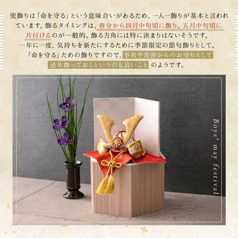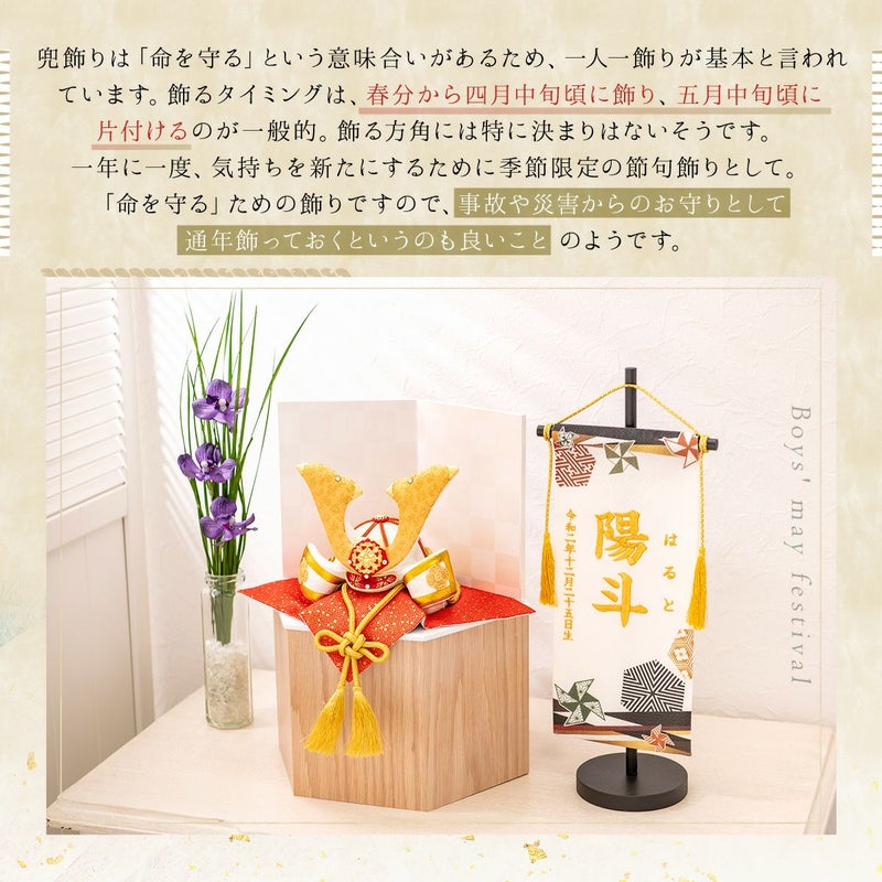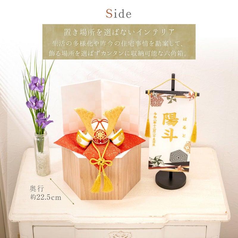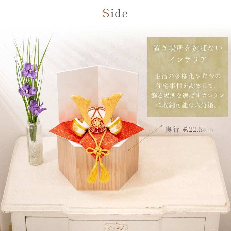 他の画像を見る 定価 ¥ 48,600 のところ 販売価格 ¥ 48,600 税込 おしゃれでモダンな五月人形! 端午の節句を華やかに! 省スペースで飾れる 龍虎堂 五月人形 兜 兜飾り 武将 収納飾り 五月人形 六角箱金色悠久兜 兜飾り 風付 名前旗 風車 ちりめん リュウコドウ 送料無料 在庫切れ 詳細を見る お気に入りに登録する