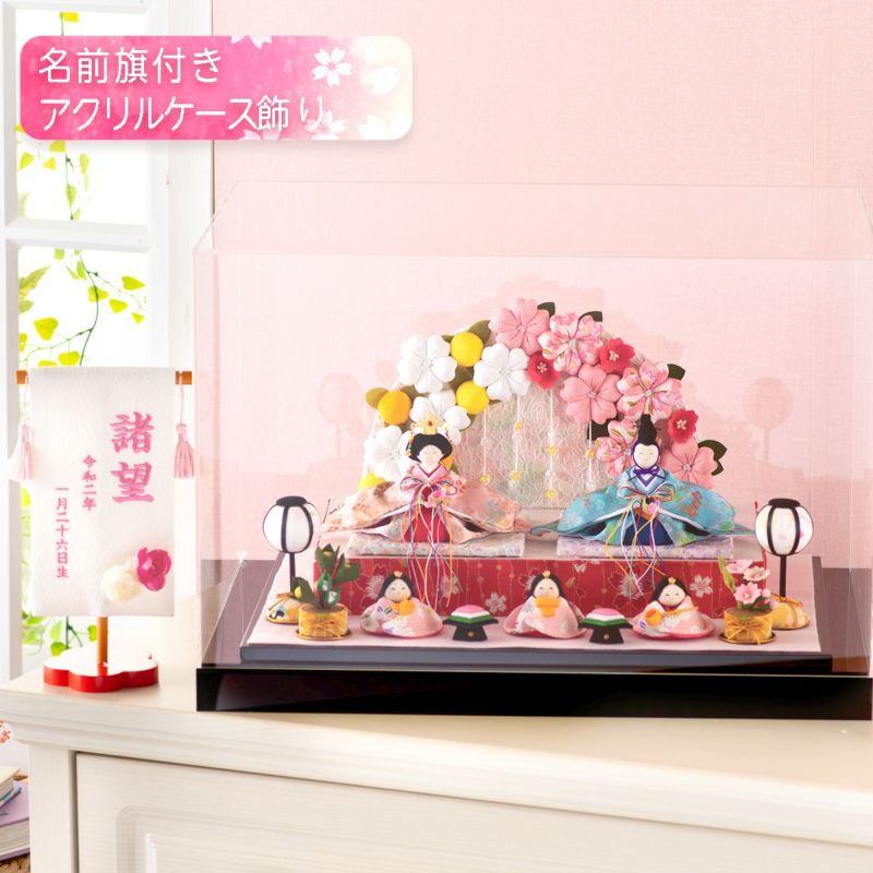 ◆【雛人形】コンパクト 当店オリジナル新作セット ひな人形 ちりめん ミニ 舞桜雛 名前旗付き 刺繍 アクリルケース オリジナル お雛様 おひな様 京都老舗 龍虎堂 リュウコドウ◆