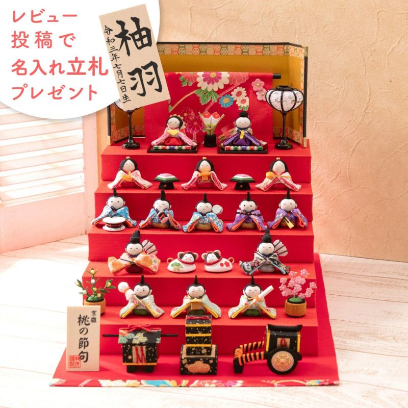 女の子のお祝い「初節句 桃の節句 ひな祭り」おんなの子の健やかな成長を願ってお雛様を贈ります。収納ケースに自分で片づけをし、かわいいお雛様を大切にする心も育みます。プレゼント、ギフト、ディスプレイやインテリアにも最適なコンパクトサイズでマンションや玄関飾りとしても人気の節句飾りです。
