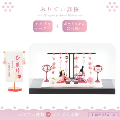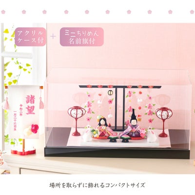 ◆【雛人形】コンパクト 当店オリジナル新作セット 親王飾り おしゃれ ちりめん 小さい ミニ ぷりてぃ舞桜 ぽんぽん兎雛 名前旗付き 刺繍 アクリルケース オリジナル お雛様 ひな祭り 京都老舗 龍虎堂 リュウコドウ◆