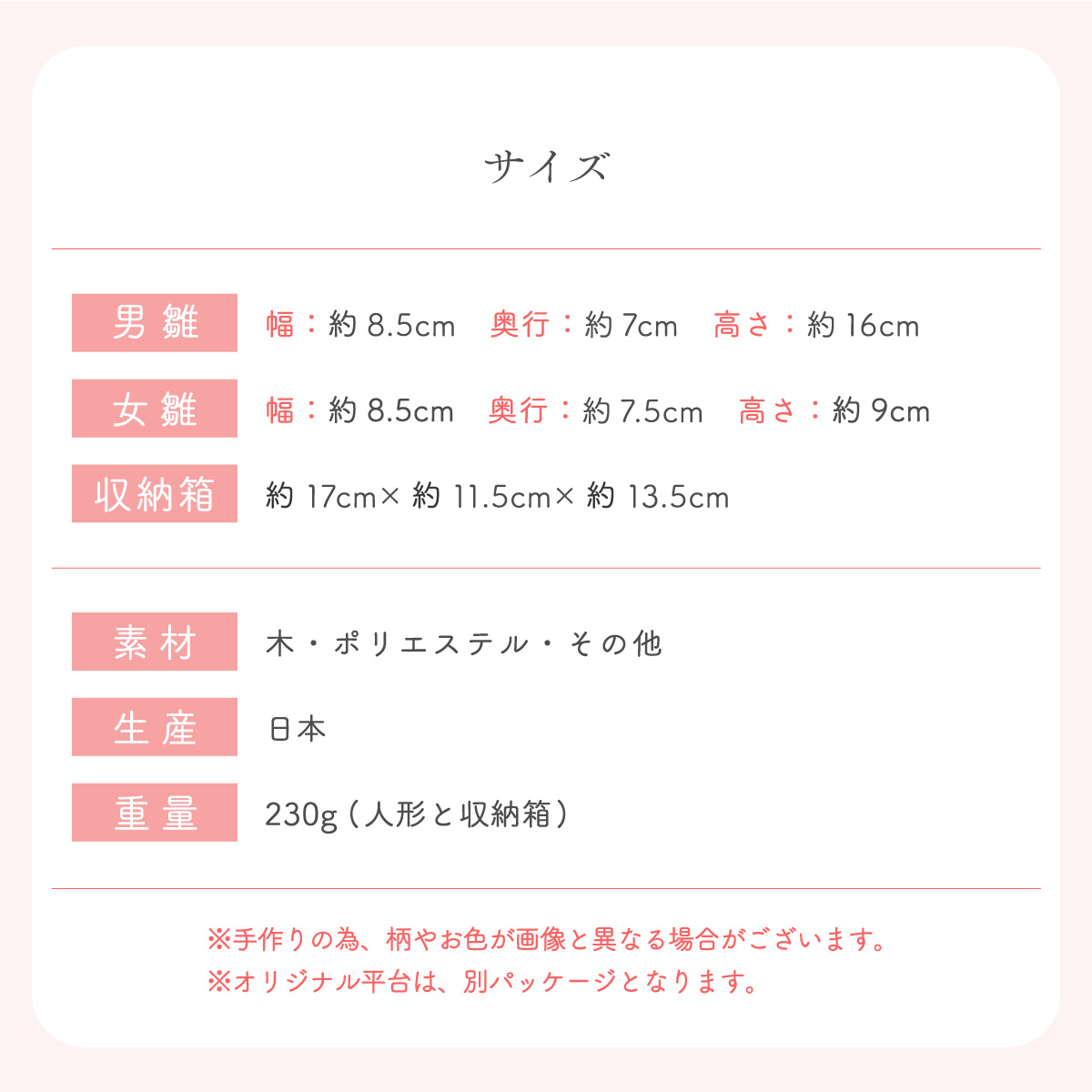 雛人形サイズ(cm):男雛-幅約8.5/高さ16,女雛-幅約8.5/高さ9