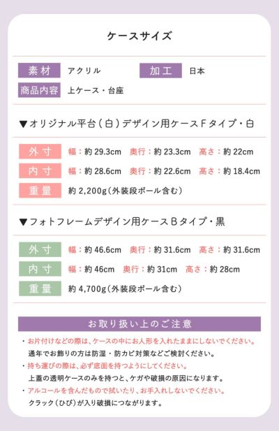 アクリルケースサイズ(cm):Fタイプ-幅約29.3/奥行23.3/高さ22,Bタイプ-幅約46.6/奥行31.6/高さ31.6