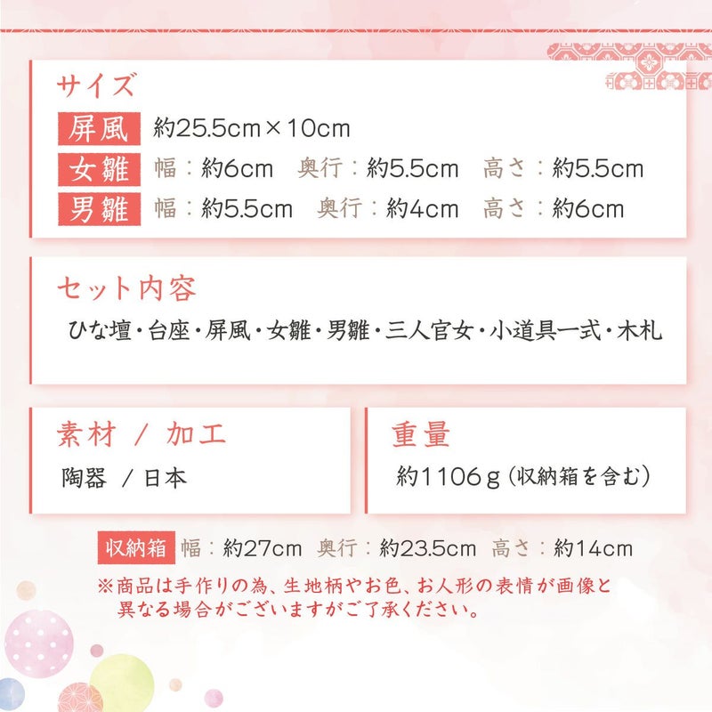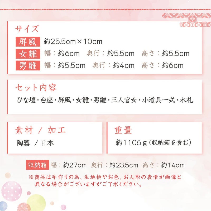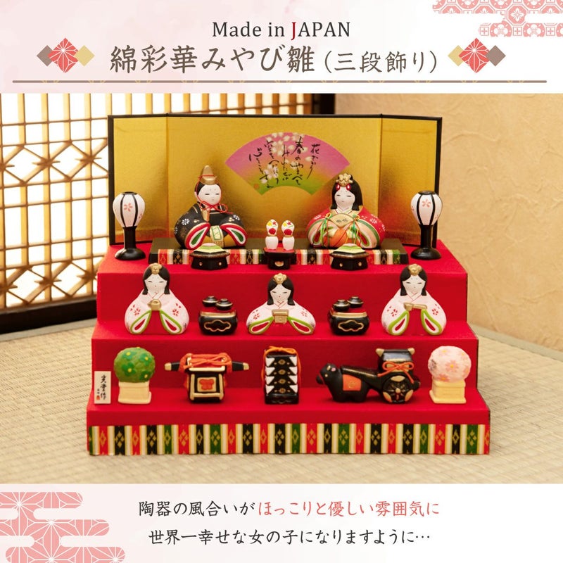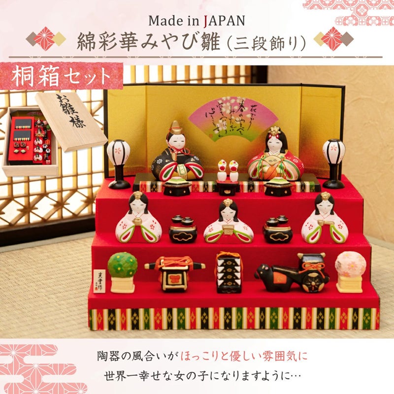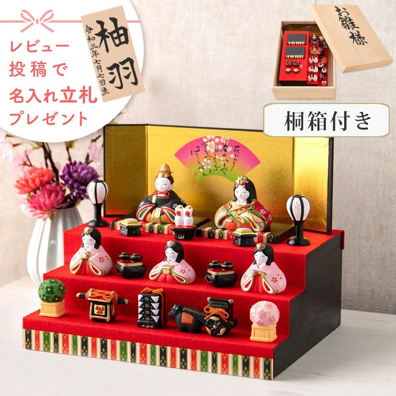 他の画像を見る 販売価格 ¥ 25,900 税込 詳細を見る お気に入りに登録する 送料無料 おしゃれなひな人形 30cmスペースで飾れる! 雛人形 コンパクト かわいい 三段飾り 桐箱 錦彩華みやび雛 五人飾り 陶器 薬師窯 在庫切れ