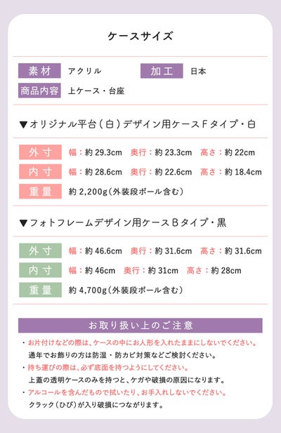 アクリルケースサイズ(cm):Fタイプ-幅約29.3/奥行23.3/高さ22,Bタイプ-幅約46.6/奥行31.6/高さ31.6