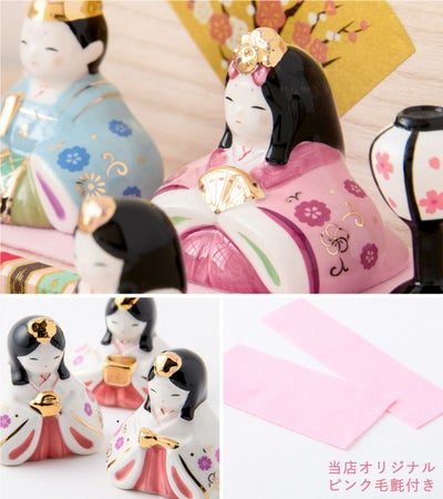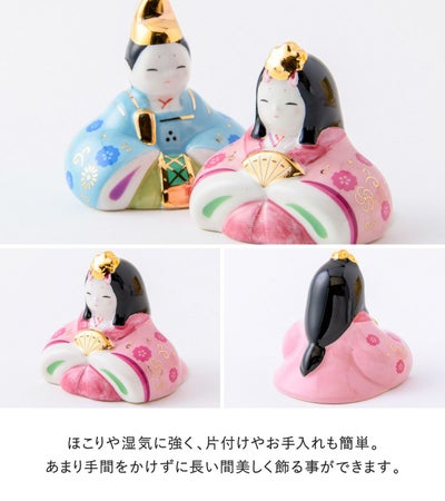 春らしい淡色の陶器雛に艶やかな金が上品に輝きます。
