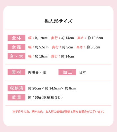 雛人形サイズ(cm):全体-幅約19/奥行14/高さ10.5・女雛-幅約5.5/高さ5.5