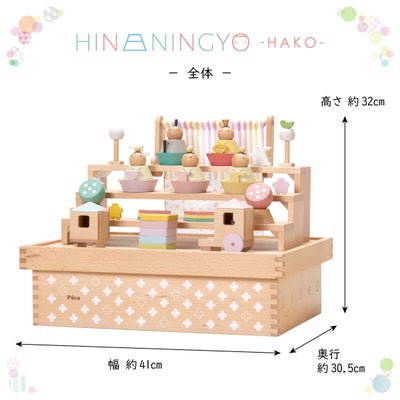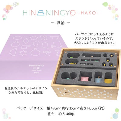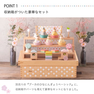 商品特徴:プーカの雛人形に収納箱やパーツも増えて豪華なセットになりました。ボリュームは増えたけど、小さなスペースで飾れるようにコンパクトにまとめました。