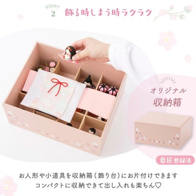 付属:お雛さま・お内裏さま・三人官女・五人囃子・雪洞・菱餅・几帳・台(収納箱)【意匠登録出願済】・毛氈