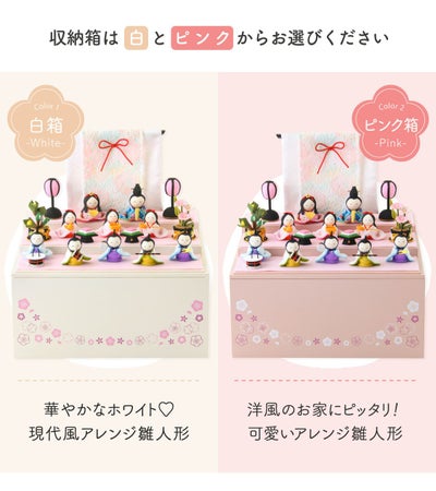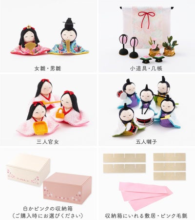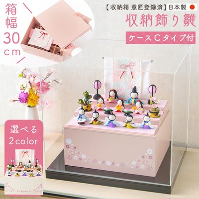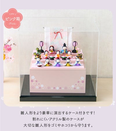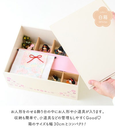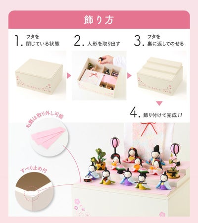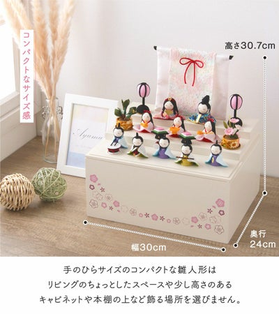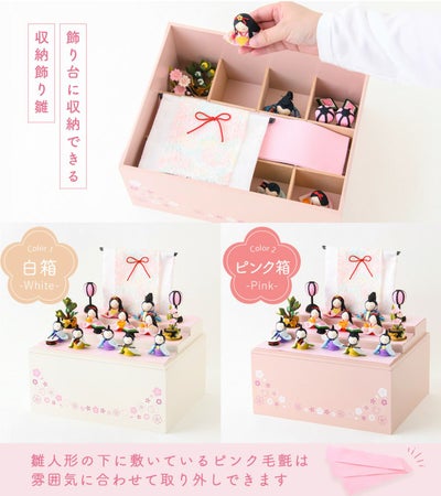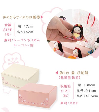 女の子のお祝い「初節句 桃の節句 ひな祭り」おんなの子の健やかな成長を願ってお雛様を贈ります。収納ケースに自分で片づけをし、かわいいお雛様を大切にする心も育みます。プレゼント、ギフト、ディスプレイやインテリアにも最適なコンパクトサイズでマンションや玄関飾りとしても人気の節句飾りです。