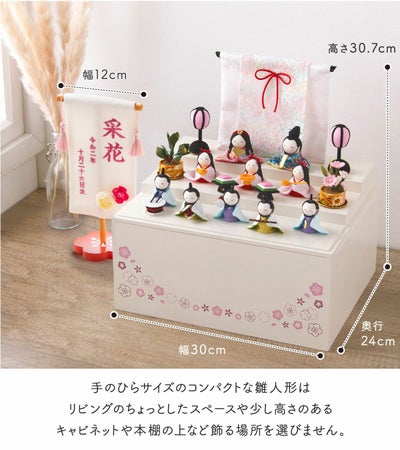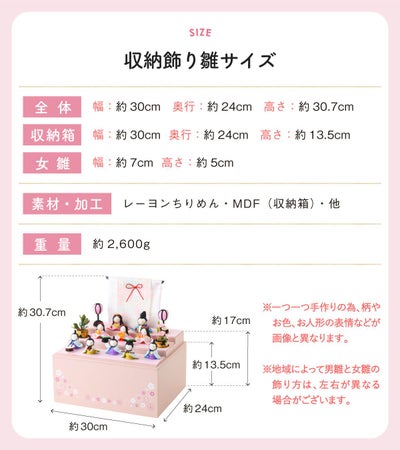 雛人形サイズ(cm):本体(雛人形のみ)-幅約30/奥行24/高さ30.7、女雛-幅約7/高さ5