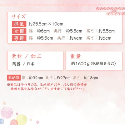 雛人形サイズ(cm):全体-幅約26/奥行30/高さ27・女雛-幅約6/高さ5.5