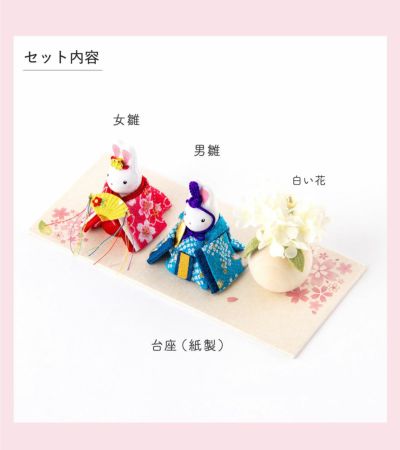 商品特徴:白いお花と可愛らしいこうさぎのお雛様。場所をとらないコンパクトなちりめん細工です。