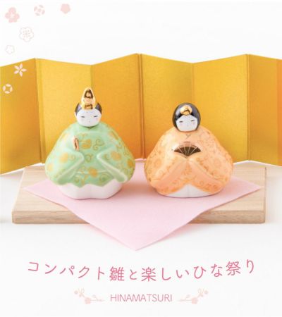 春らしい淡色の陶器雛に艶やかな金が上品に輝きます。