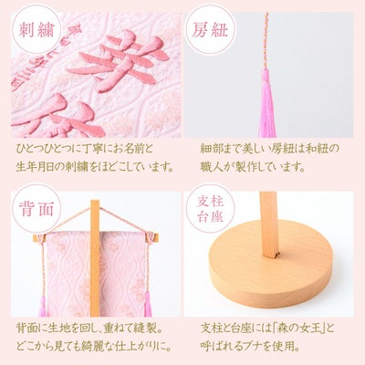 節句人形(ひな人形・五月人形・こいのぼり・兜)などと一緒にお飾りいただいたり、お食い初めやお宮参り、七五三のお祝いの席にも最適です。