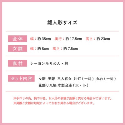 雛人形サイズ(cm):全体-幅約35/奥行17.5/高さ23・女雛-幅約8/高さ7.5