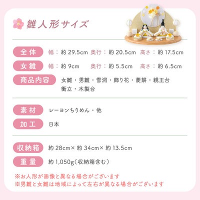 雛人形サイズ(cm):全体-幅29.5×奥行20.5×高さ17.5cm,女雛-幅約9/奥行5.5/高さ6.5