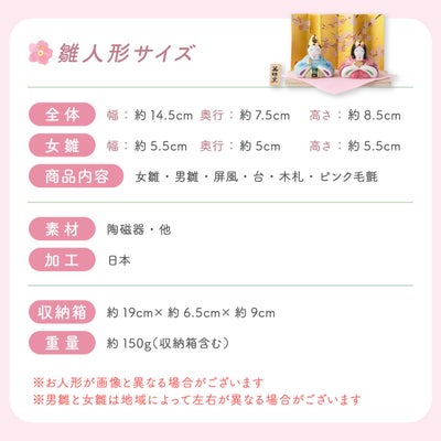 雛人形サイズ(cm):全体-幅約14.5/奥行7.5/高さ8.5・女雛-幅約5.5/高さ5.5