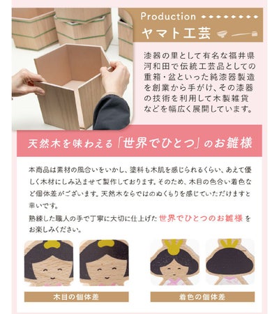 古の習わしと現代の雛祭りを融合し、お子さまのお部屋にお飾りいただく、季節を演出するインテリア、お店などのディスプレイや恋人への沢山の思いを込めたプレゼントなど、多くのシーンで大活躍します。