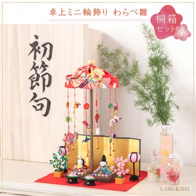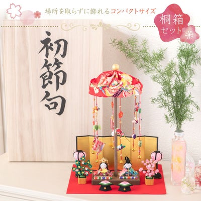 商品特徴:手のひらサイズの小さい雛人形に吊るし輪飾りがゆれるかわいいお雛様。金屏風と赤い毛氈、雪洞、菱餅、桜橘がセットのミニサイズでも豪華なひな人形です。