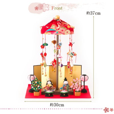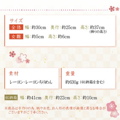 雛人形サイズ(cm):全体-幅約30/奥行25/高さ37(輪飾りの高さ)・女雛-幅約5/高さ6