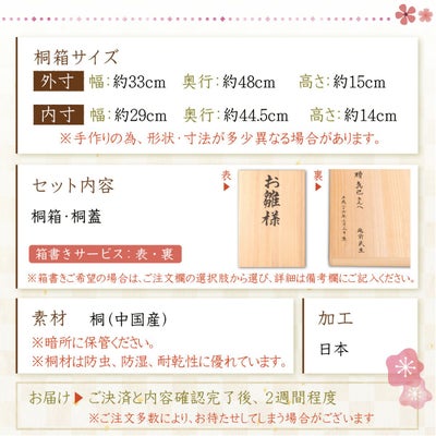 桐箱サイズ(cm):外寸-幅約33/奥行48/高さ15 ・ 内寸-幅約29/奥行44.5/高さ14