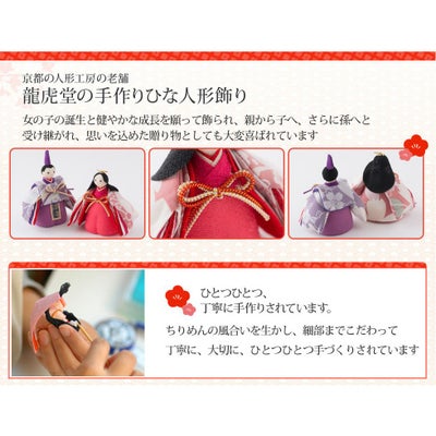 女の子が産まれての「初節句」は、嫁方の親が子供の身代わりとなって災いが降りかからない様に、という思いが込められ雛人形を贈ります。古の習わしと現代の雛祭りを融合し、お子さまのお部屋にお飾り頂く、季節を演出するインテリア、お店などのディスプレイや恋人への沢山の思いを込めたプレゼントなど多くのシーンで大活躍します。