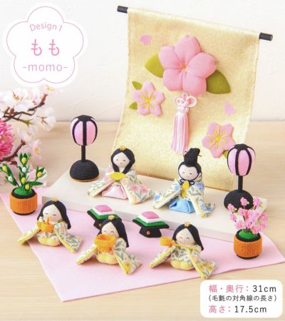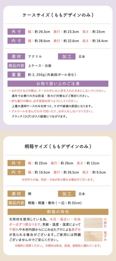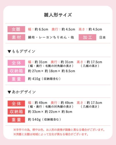雛人形サイズ(cm):もも-全体-幅約31/奥行31/高さ17.5,あか-全体-幅約49/奥行49/高さ17.5・女雛-幅約6.5/高さ4.5