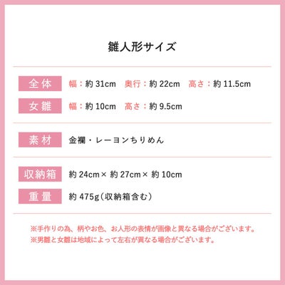 雛人形サイズ(cm):全体-幅約31/奥行22/高さ11.5・女雛-幅約10/高さ9.5