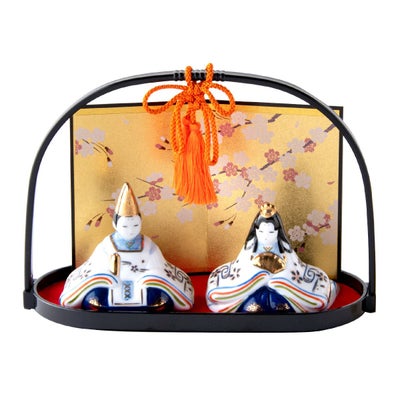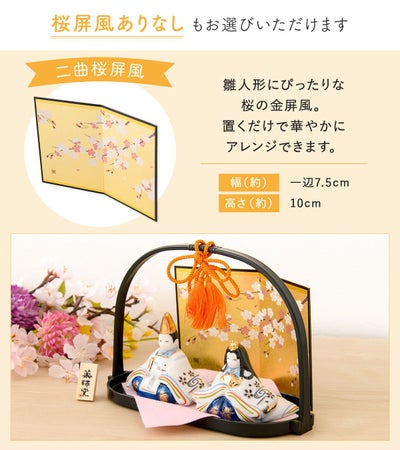 雛人形 コンパクト かわいい 染錦手籠雛(大手籠付) 親王飾り 陶器 薬師窯 桐箱 桜屏風 ピンク毛氈付
