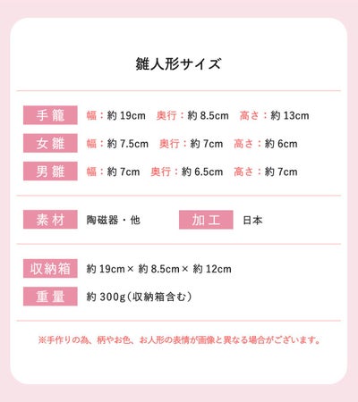 雛人形サイズ(cm):全体-幅約19/奥行8.5/高さ13・女雛-幅約7.5/高さ6